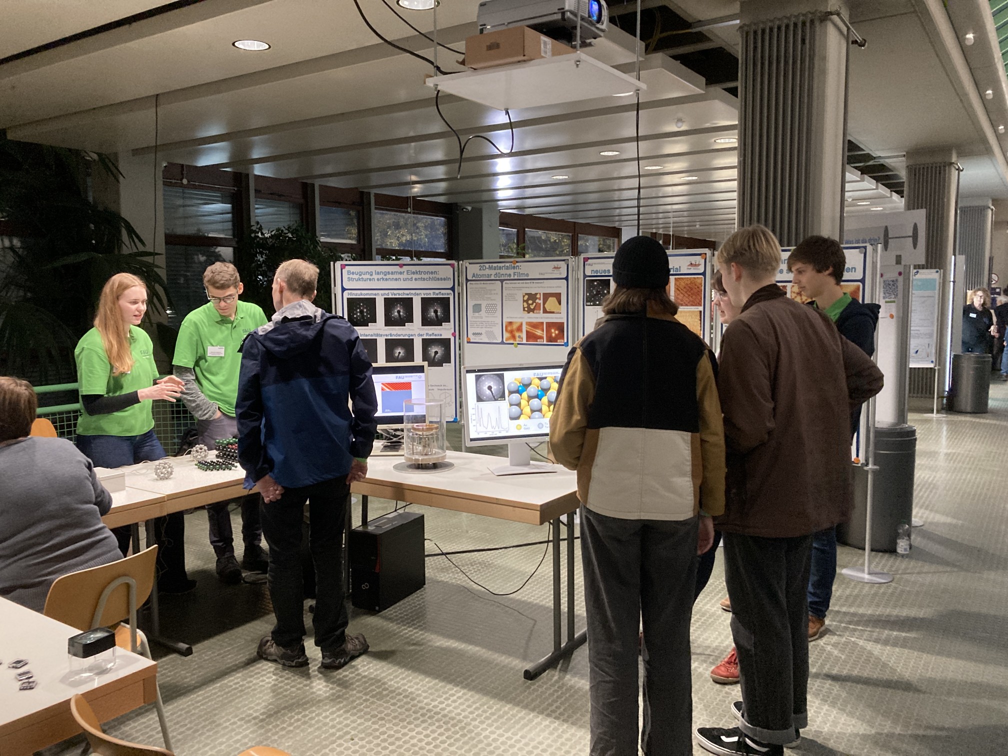 At this years Long Night of the Sciences (Lange Nacht der Wissenschaften) we presented our work to the general public. Hannah, Isabella, Alexander, and Eric showed and explained not only how LEED and STM produce scientific data but also presented real instruments. Video animations, 3D models and posters triggered questions and led to fruitful exchanges of thoughts. The picture shows the booth at an relatively early time of the truly long night – many more people came to visit us!